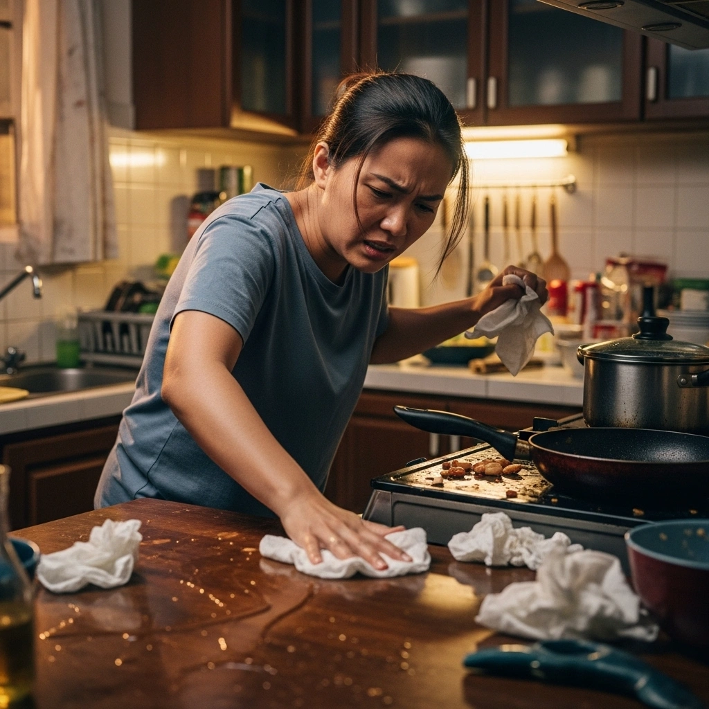Meja melekit, dapur berselerak, emosi pun jadi penat.